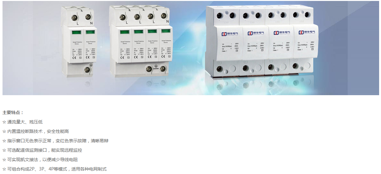 浪涌保護(hù)器(SPD)實(shí)際上是一種壓敏電阻,具有高通、低電阻的特點(diǎn)。當(dāng)電網(wǎng)在不超過(guò)高連續(xù)工作電壓的條件下運(yùn)行時(shí),兩電極處于高電阻狀態(tài)。如果兩電極之間的電壓由于雷電操作過(guò)電壓而超過(guò)點(diǎn)火電壓,則間隙將被打破,并通過(guò)電弧放電釋放能量。沖擊波過(guò)后,由分弧器和滅弧室組成的滅弧系統(tǒng)將電弧熄滅,并恢復(fù)到高阻狀態(tài)以保護(hù)系統(tǒng)。(浪涌保護(hù)器的作用)。